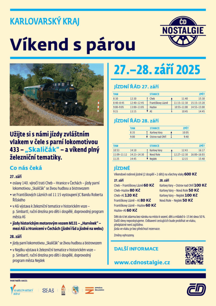 Dne 27. září čeká Chebany jedinečný zážitek – na chebském viaduktu se hned čtyřikrát objeví parní lokomotiva Skaličák. Poprvé projede směrem z Chebu do Františkových Lázní kolem půl deváté ráno, podruhé pak po poledni kolem 12:30. V opačném směru ji bude možné zahlédnout kolem 11:35 a poté ještě jednou v 15:25. Parní vlak vyjede z Chebu v rámci akce nazvané Víkend s párou, která letos připomene i kulaté výročí – 140 let od otevření trati Cheb – Hranice v Čechách. Do programu je proto zařazena také zvláštní jízda parní lokomotivou z Chebu do Aše. Cestující se mohou těšit na živou hudbu přímo ve vlaku, bistrovůz, v Aši pak na výstavu k železniční tématice v historickém voze, doprovodný program a navíc i možnost svézt se motorovým vozem Hurvínek mezi Aší a Hranicemi v Čechách. Další podrobnosti, včetně jízdních řádů a cen jízdného, najdou zájemci na plakátu nebo také na webu www.cdnostalgie.cz