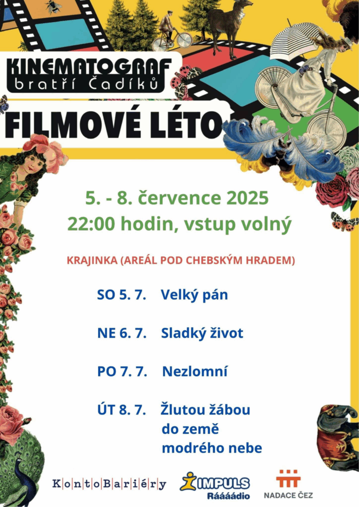 Kinematograf bratří Čadíků zavítá i v roce 2025 do Chebu. Tradiční letní kino pod širým nebem se uskuteční na obvyklém místě – v areálu „Krajinka“ u kavárny po hradbami chebského hradu. Promítání proběhne ve čtyřech po sobě jdoucích večerech na začátku července, konkrétně v termínu 5.–8. července, vždy od 22:00 hodin (s ohledem na aktuální počasí). Vstupné na promítání filmů je volné (dobrovolné).