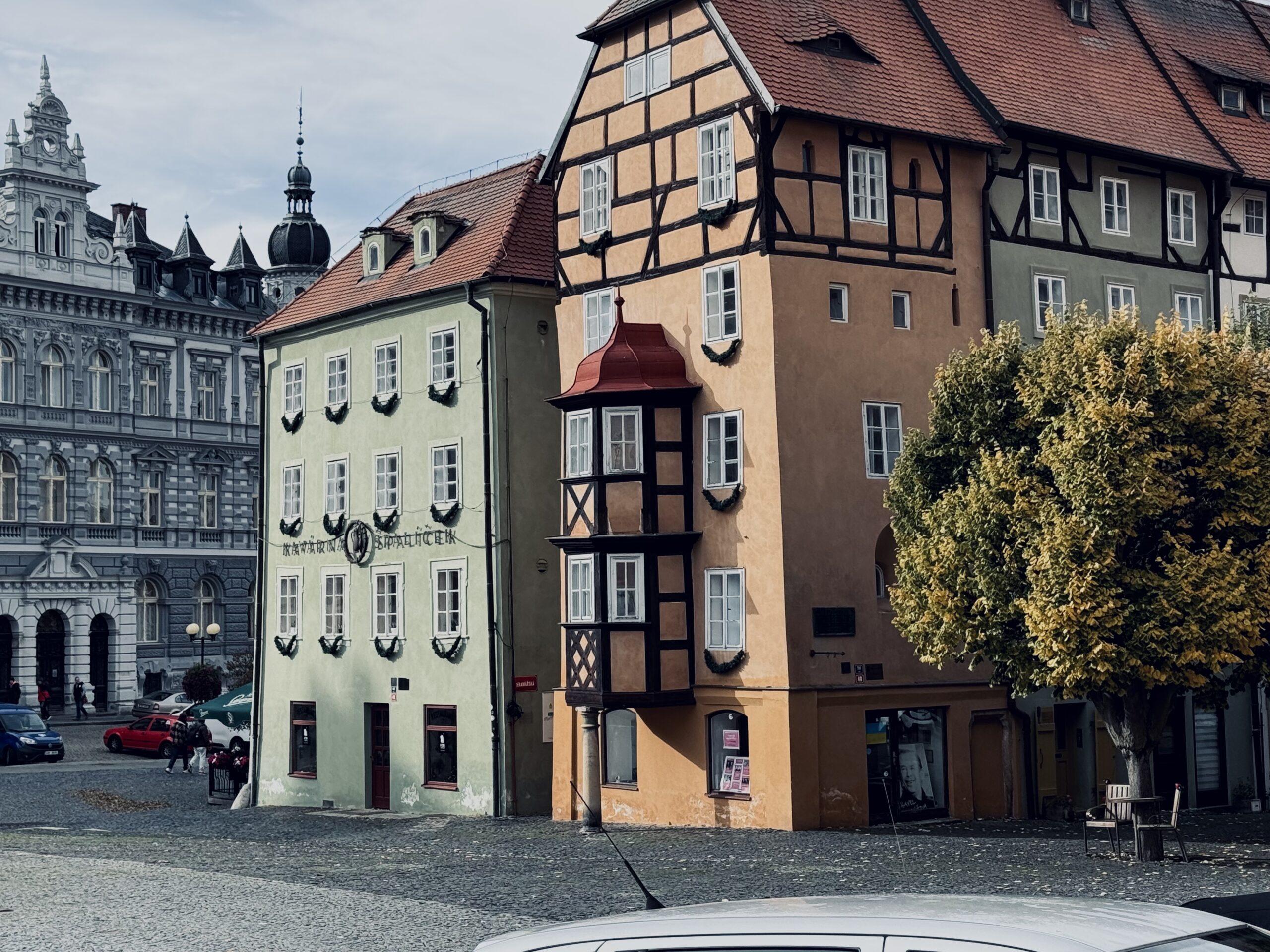 Na chebských domech se již pomalu začíná objevovat vánoční výzdoba. Na Špalíčku jsou již zelené girlandy v oknech (19 října 2025)