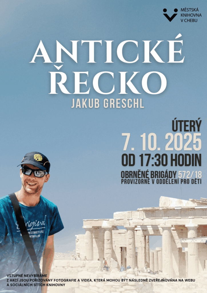 Cestování, fotografie a inspirativní příběhy – to vše spojuje Jakub Greschler, mladý muž, který i přes svůj handicap dokazuje, že svět patří odvážným. Jakub rád objevuje nová místa, zachycuje je objektivem svého fotoaparátu a poté o svých dobrodružstvích poutavě vypráví na cestovatelských přednáškách. A nyní se tento odvážný cestovatel ukáže opět i u nás v Chebu. Tentokrát se vydáme s Jakubem do antického Řecka – země bohů, bájí a nádherných památek. O své dojmy, příběhy i osobní postřehy se podělí v úterý 7. října 2025 v pobočce chebské knihovny – Oddělení pro děti v ulici Obrněné brigády 572/18.